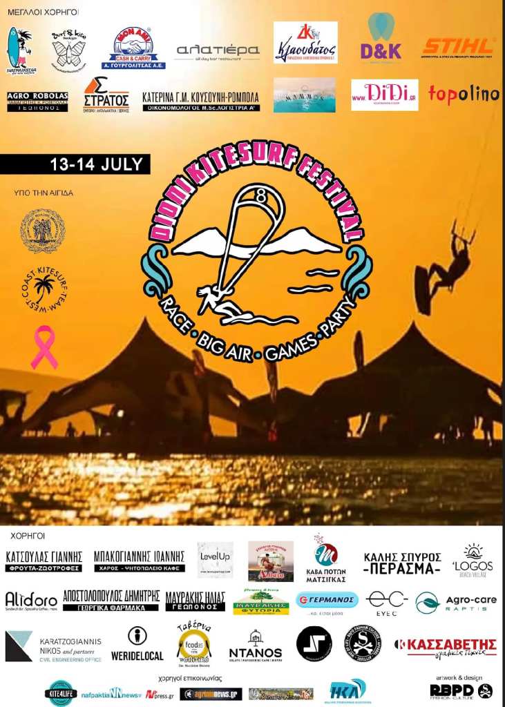 Η ομάδα West Coast Kitesurf σε συνεργασία με τον Ναυτικό Όμιλο Μεσολογγίου προκηρύσσουν και συνδιοργανώνουν, το 8o Kitesurf Festival στην παραλία Διόνι Κατοχής στο Δήμο Ιεράς Πόλεως Μεσολογγίου.